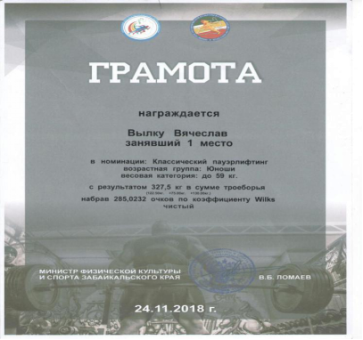 Вылку Вячеслав- победитель в региональных соревнованиях” “Классическое троеборье” в номинации “ Классический пауэрлифтинг”